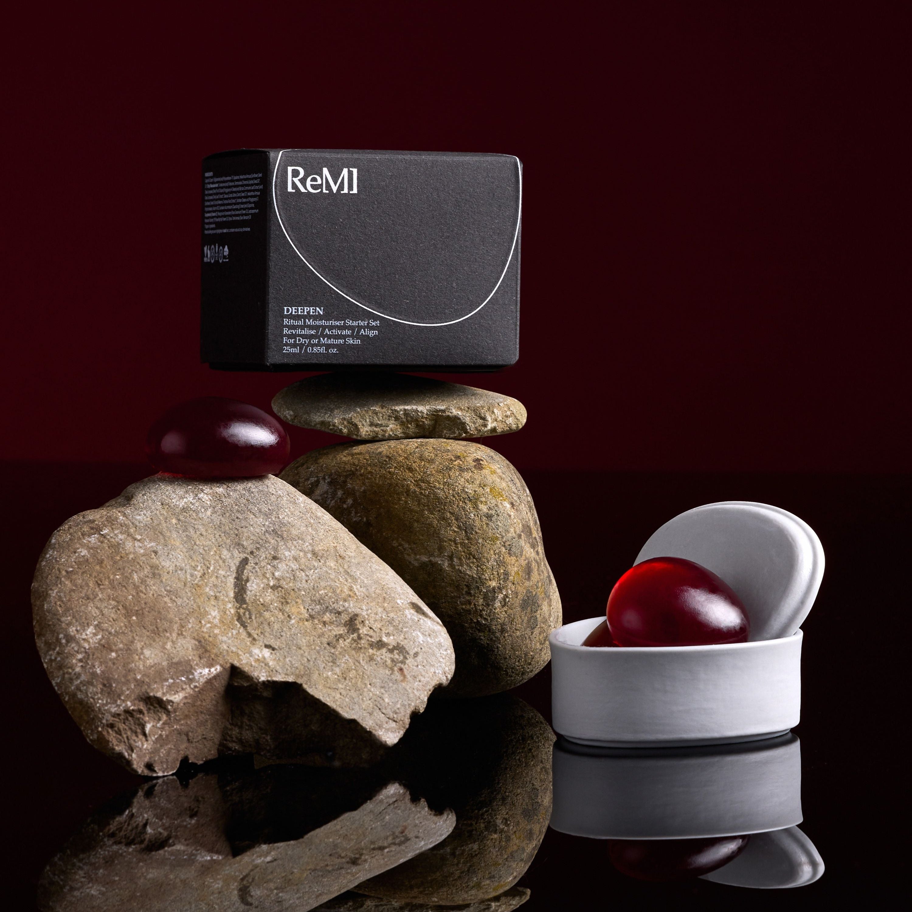 The ultimate expression of the ReMI ritual. AWAKEN Day, GROUND Night and DEEPEN Renewal Moisturiser Stones with a bespoke, handmade ceramic vessel for each. Use as one, two or three gifts.